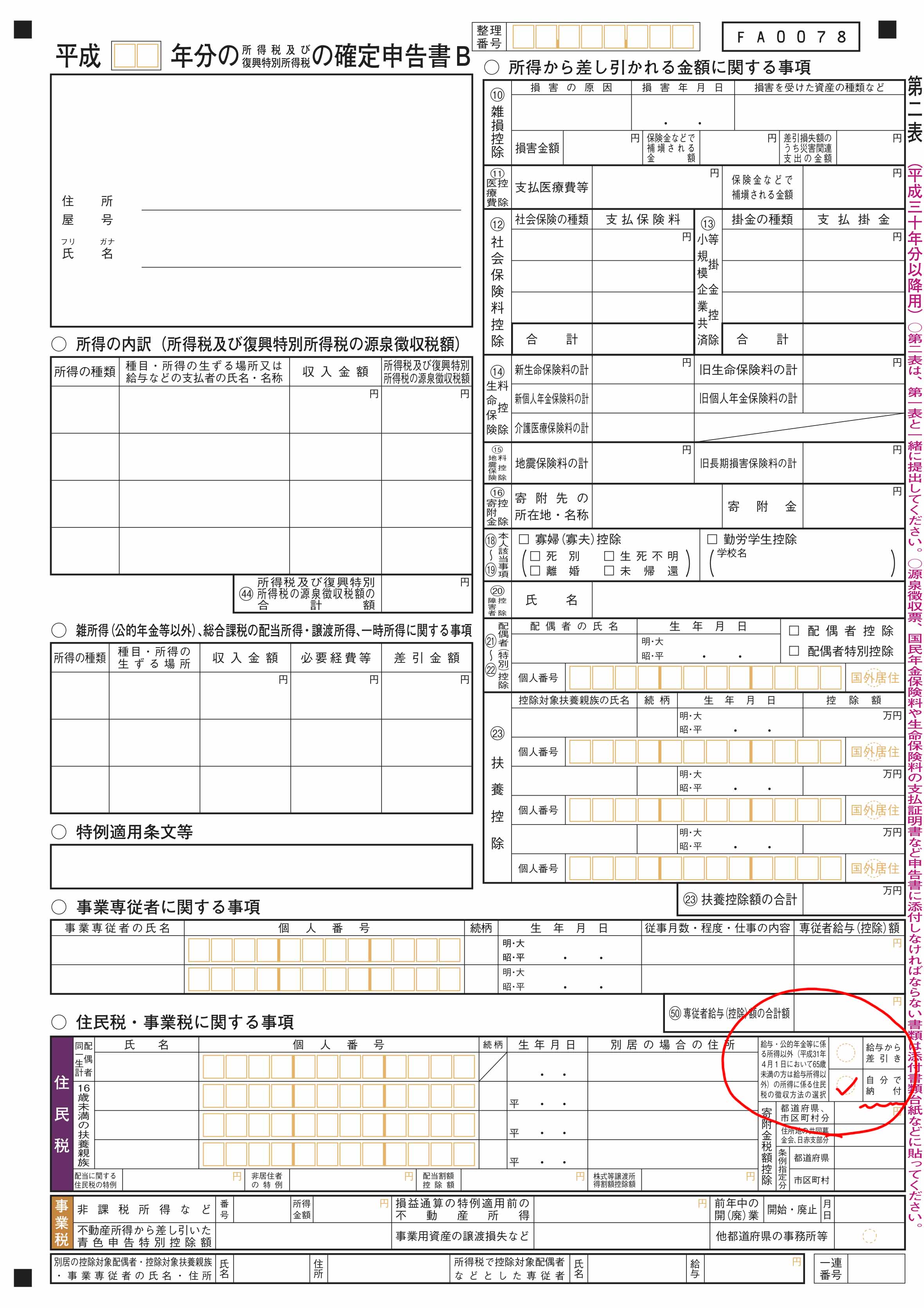 「確定申告書第二表」の「住民税に関する事項」という項目の、「給与所得以外の住民税の徴収方法の選択」というところの「自分で納付」にチェックを入れれば、副業分の住民税の請求は会社へは行かずに、あなた個人に請求されるようになります。