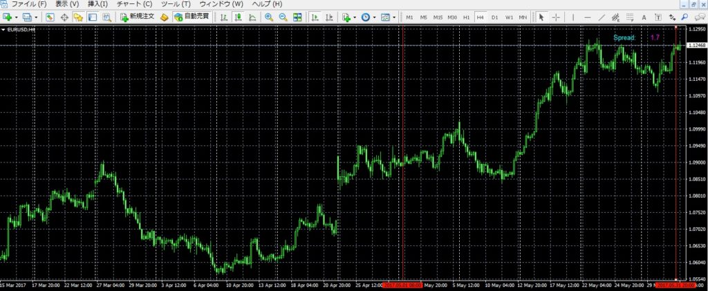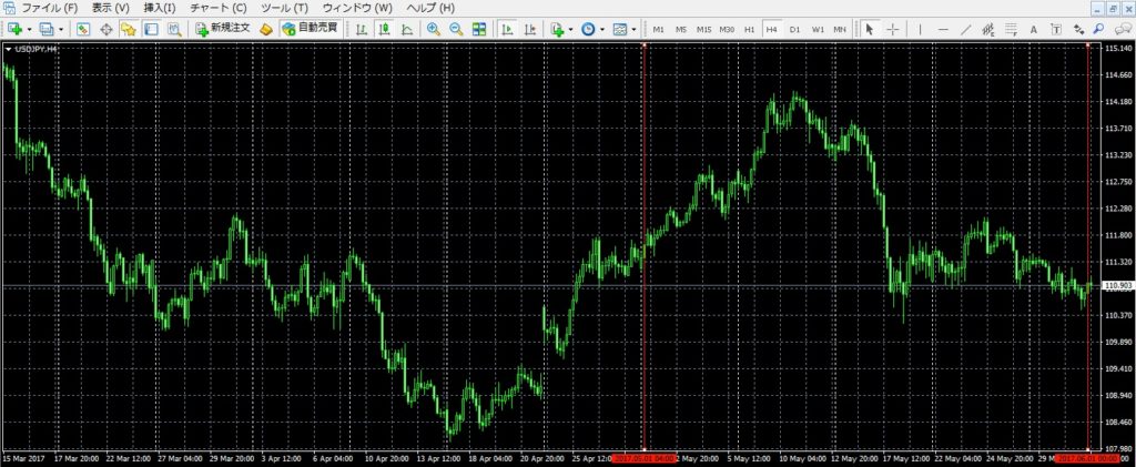 右のほうの赤い縦のラインに挟まれた区間が5月の値動きです。