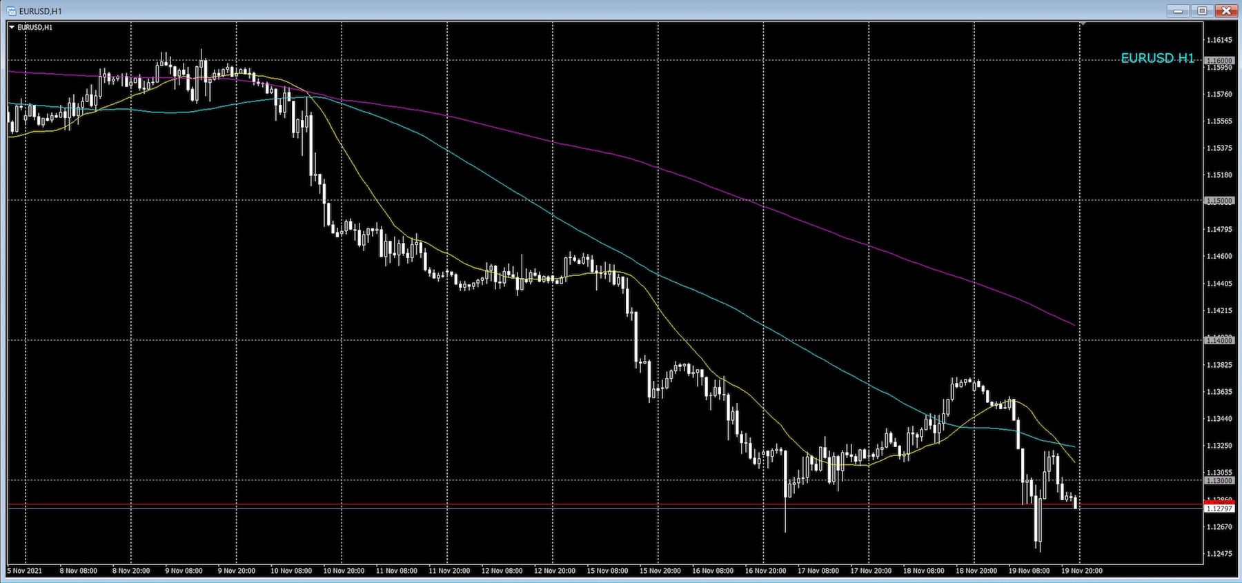 以下のチャートは、直近2週間のEURUSDの1時間足チャートですが、イイ感じのダウントレンドです。
