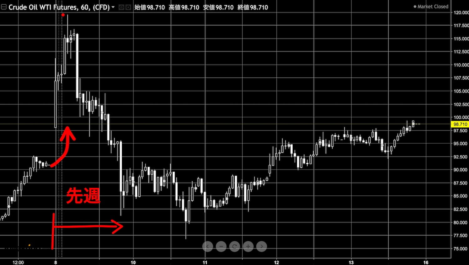 月曜日の東京時間に一時は1バレル120ドル目前まで大きく上昇…😱😱