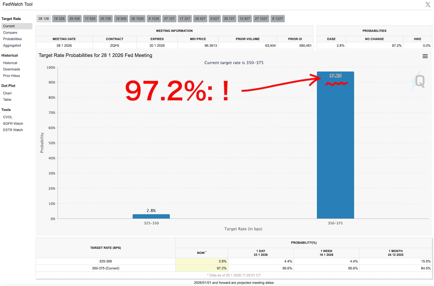 ちなみに来週のFOMCでは金利据え置きが現状は97.2%と、前週から更に100%に近づきほぼ確実視されています。